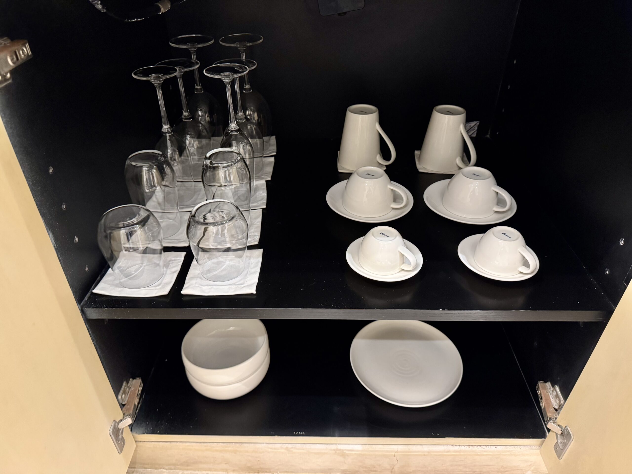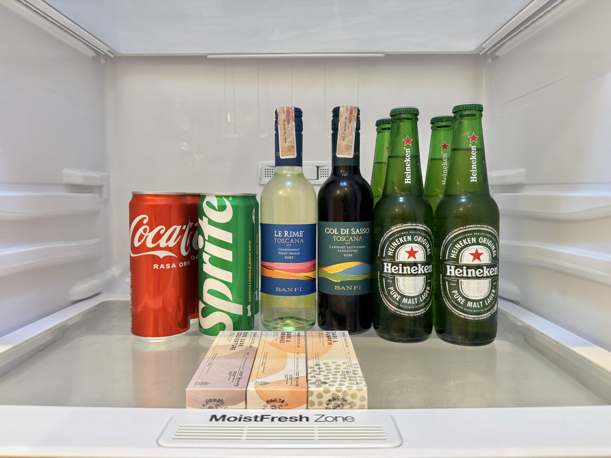 Kitchenette model terbuka menempati sebuah nook dengan sebuah kulkas besar berisikan makanan dan minuman mini bar berbayar, kompor induksi, mesin kopi dengan kapsul kopi dari Expat Roasters, teko elektrik, bucket es, piranti makan dan minum, dan meja tinggi berpermukaan marmer lengkap dengan 2 kursi stool tinggi. Menunggu di meja adalah 3 buah jeruk lokal Bali sebagai salah satu welcome amenity yang disediakan oleh hotel.