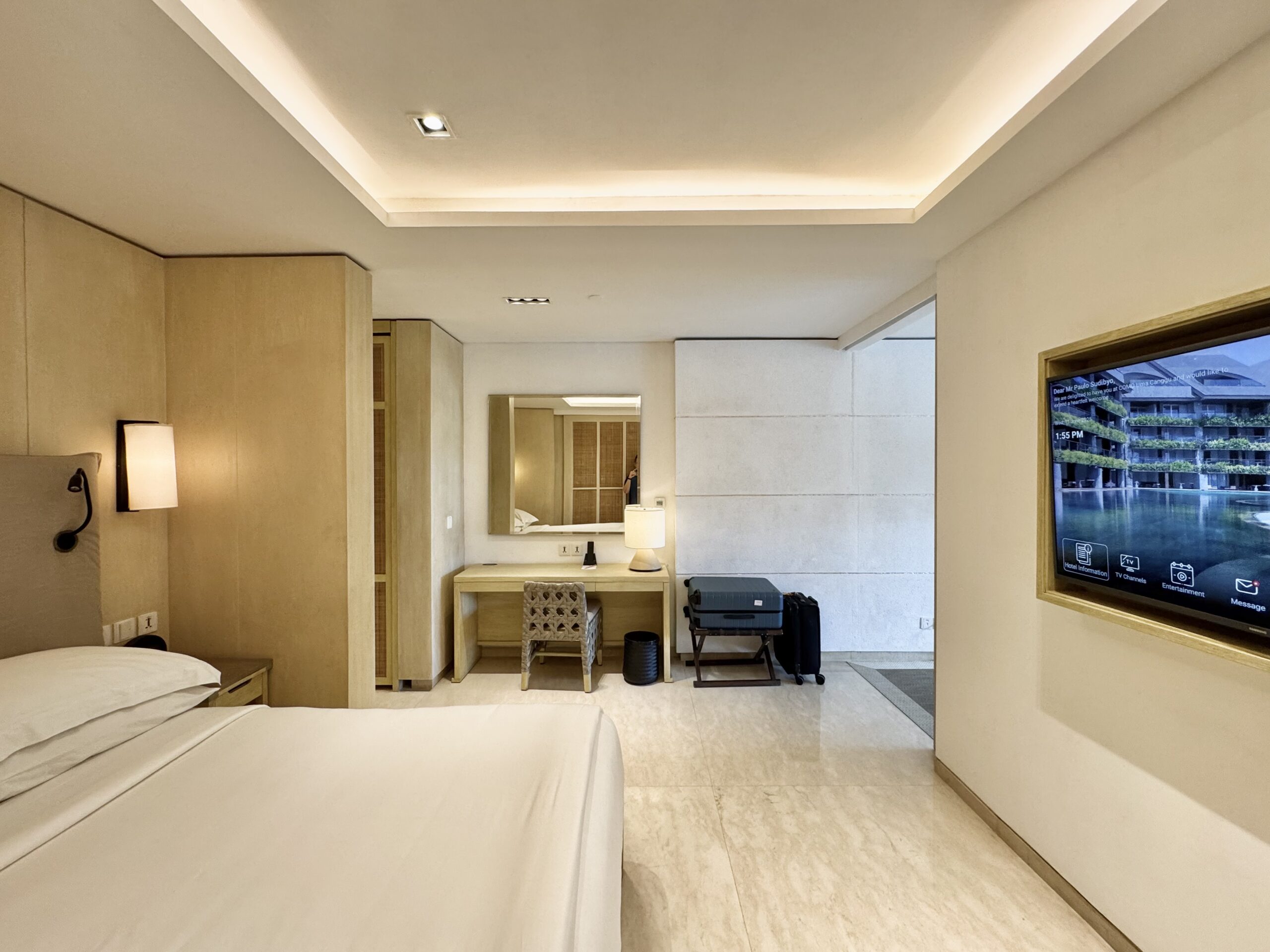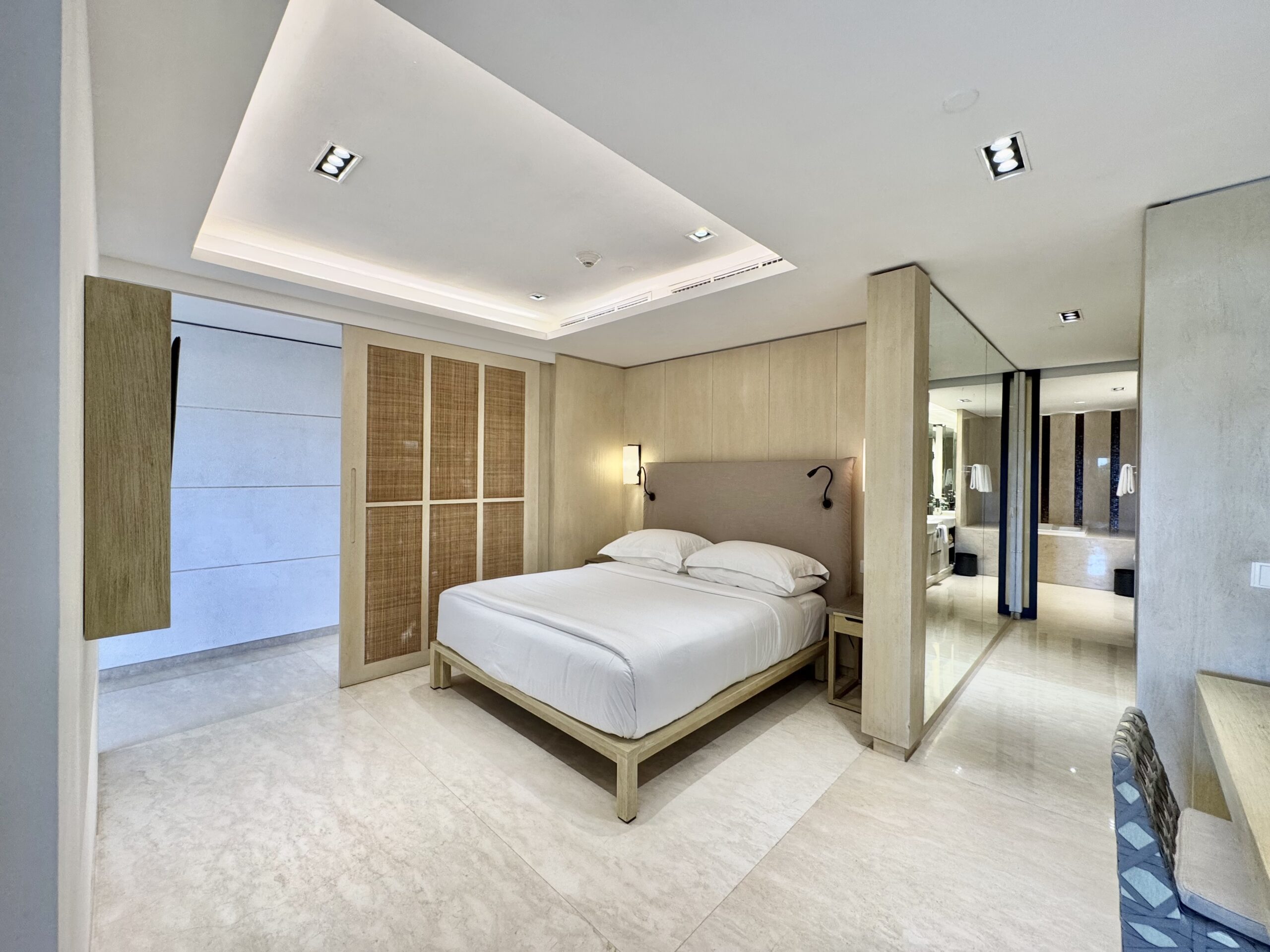 Memasuki kamar tidur yang berada di tengah ruangan saya baru merasakan ada hal yang berbeda dengan disain kamar ini, rupanya kami mendapatkan kamar yang telah direnovasi sebelumnya. Ini adalah hal yang tidak saya ketahui prior dari stay ini. Residence ini terasa lebih cerah dengan pewarnaan light finishes. Ruang tidur ini dapat diakses dari dua sisi dengan menggunakan pintu geser.