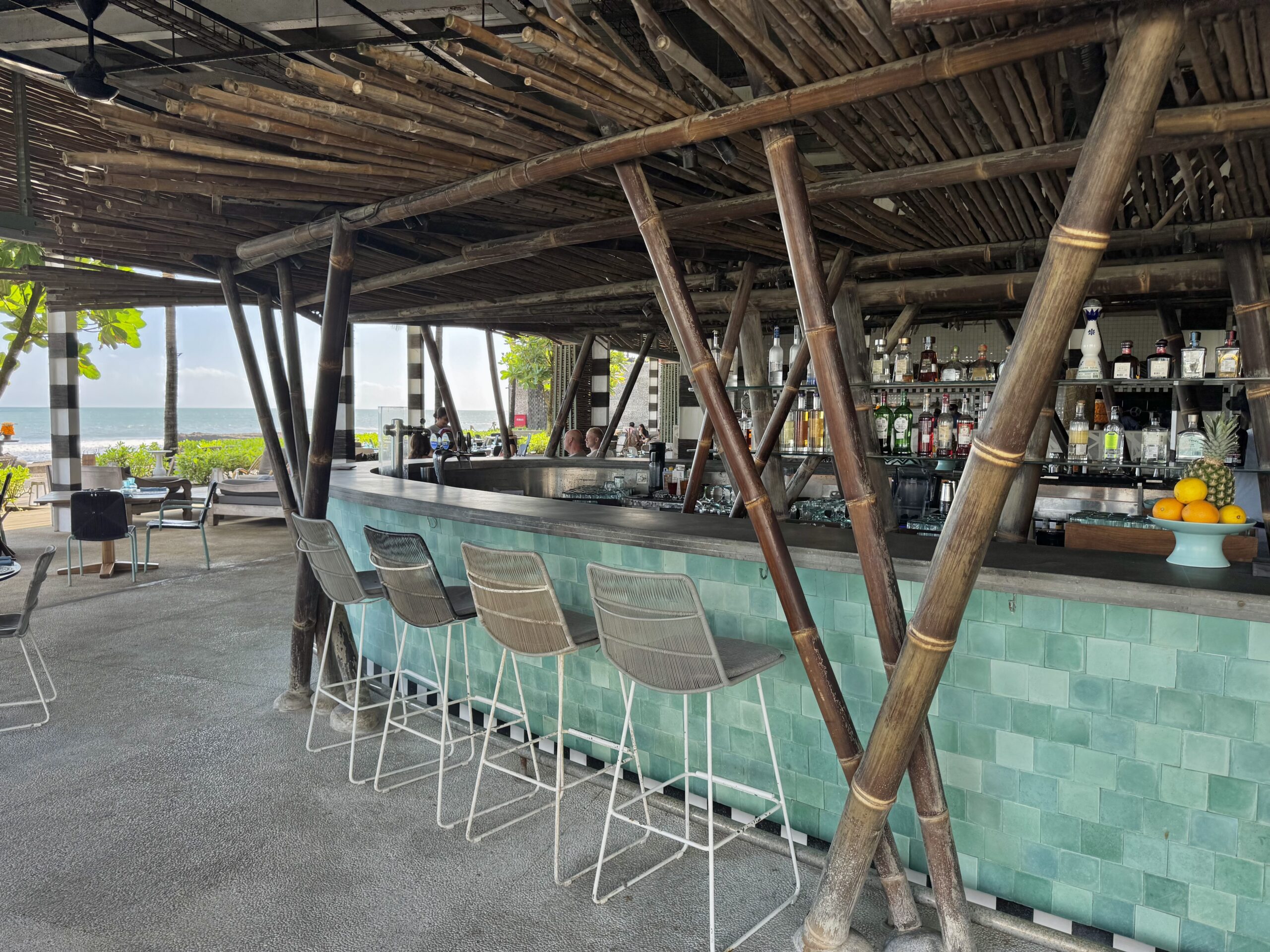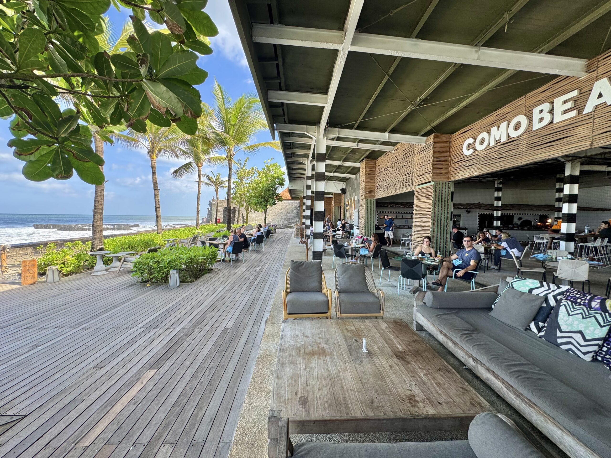 Sesuai dengan namanya, COMO Beach Club ini beroperasi sebagai sebuah beach club yang tak hanya dibuka untuk tamu menginap namun juga untuk umum. Disain dari venue ini adalah industrial yang rustic dengan elemen tropis yang kuat dan venue ini menghadap ke pantai Echo. Sebagai sebuah venue dengan proximity sangat dekat dengan pantai tentu saja membuat logam bertendensi untuk mudah korosi dan ini terlihat dari besi-besi teroksidasi yang menambah kesan rustic.