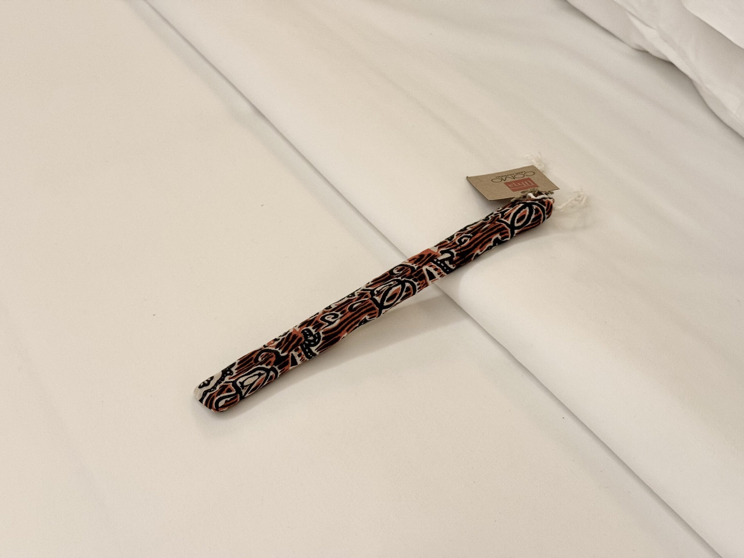 Di tiap malam hari tim housekeeping menyediakan pelayanan turndown dengan membersihkan kembali keseluruhan kamar, menutup rapat tirai, meredupkan cahaya kamar, membuka selimut, menaruh air minum dan slippers di masing-masing sisi ranjang, dan juga memberi suvenir. Selama dua malam menginap, kami menerima dua macam suvenir yang berbeda, yaitu: sedotan dari bambu yang dibungkus kain batik dan kipas angin anyaman.