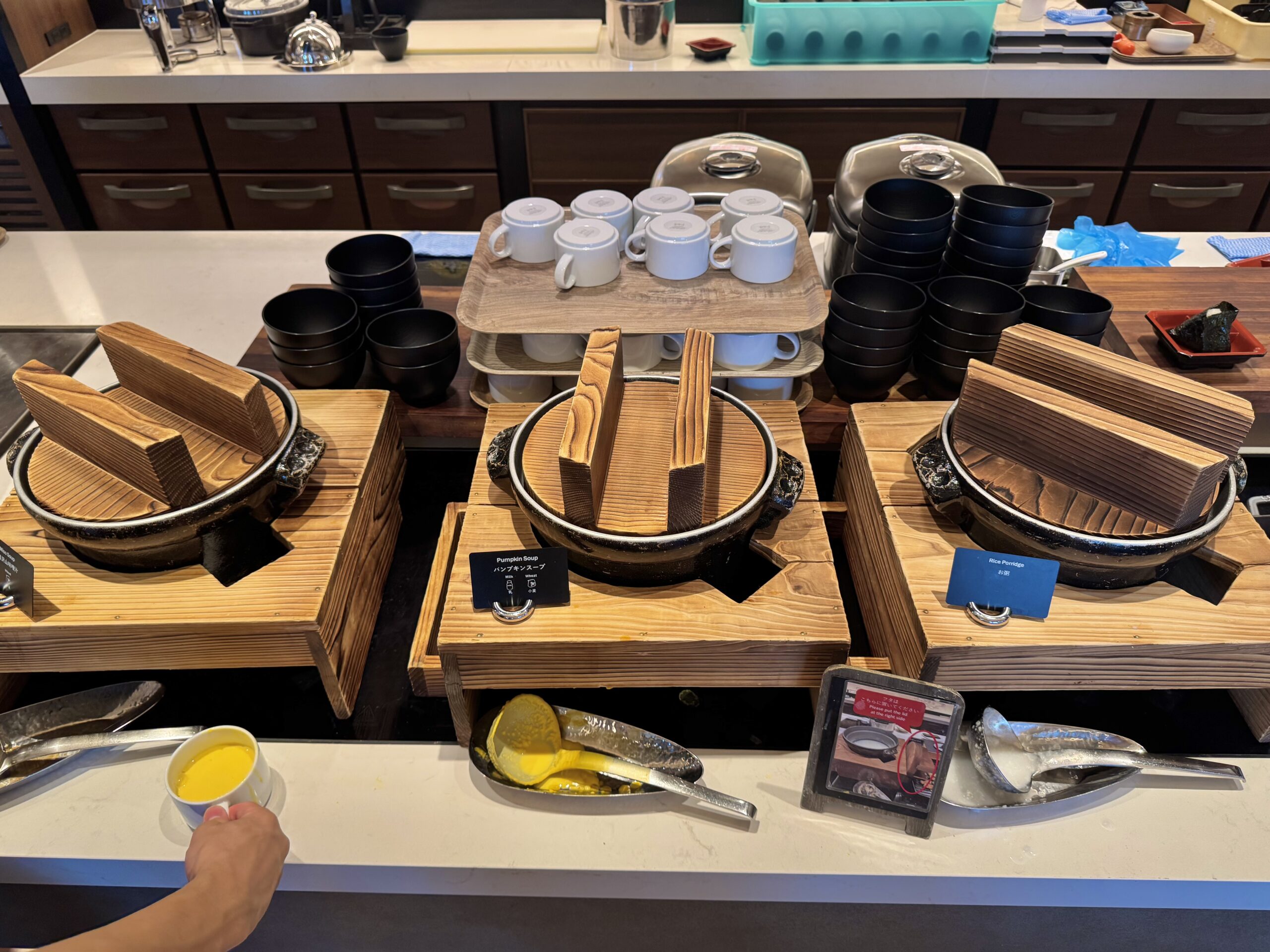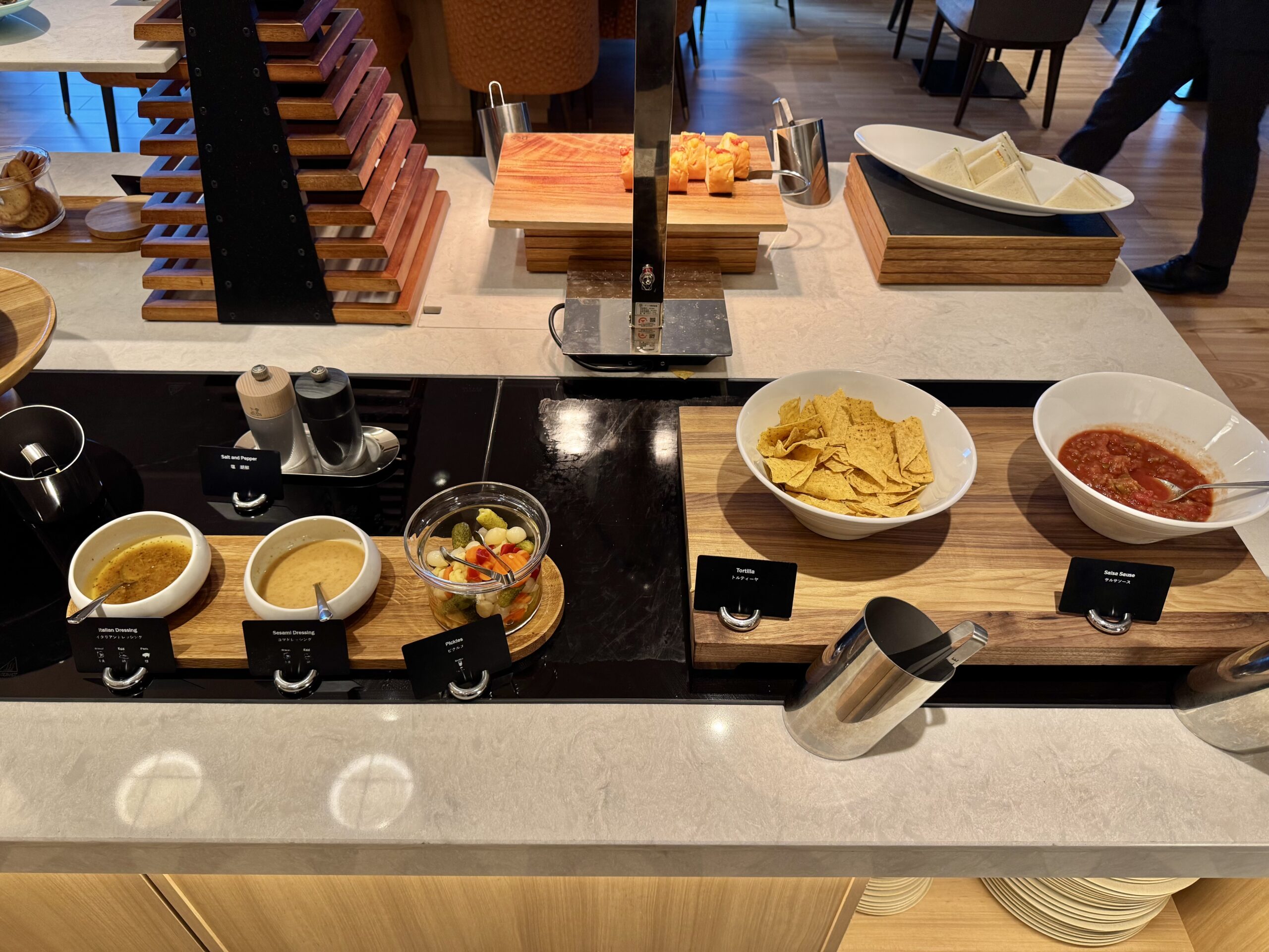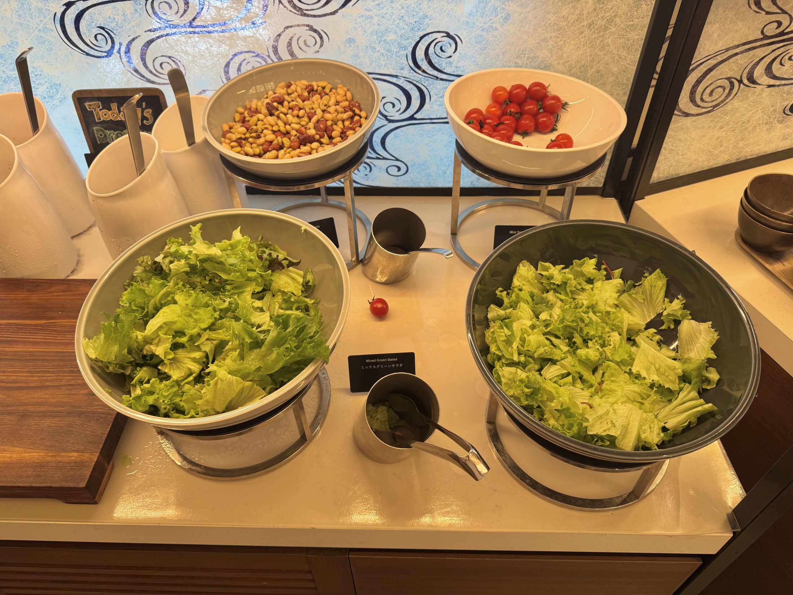 Di seberang meja counter minuman berjajar memanjang pilihan chilled juice buah, salad bar, charcuterie, zosui (hidangan Jepang berupa nasi dengan kuah kaldu), dan masakan pelengkap khas Jepang beserta beberapa macam acarnya.