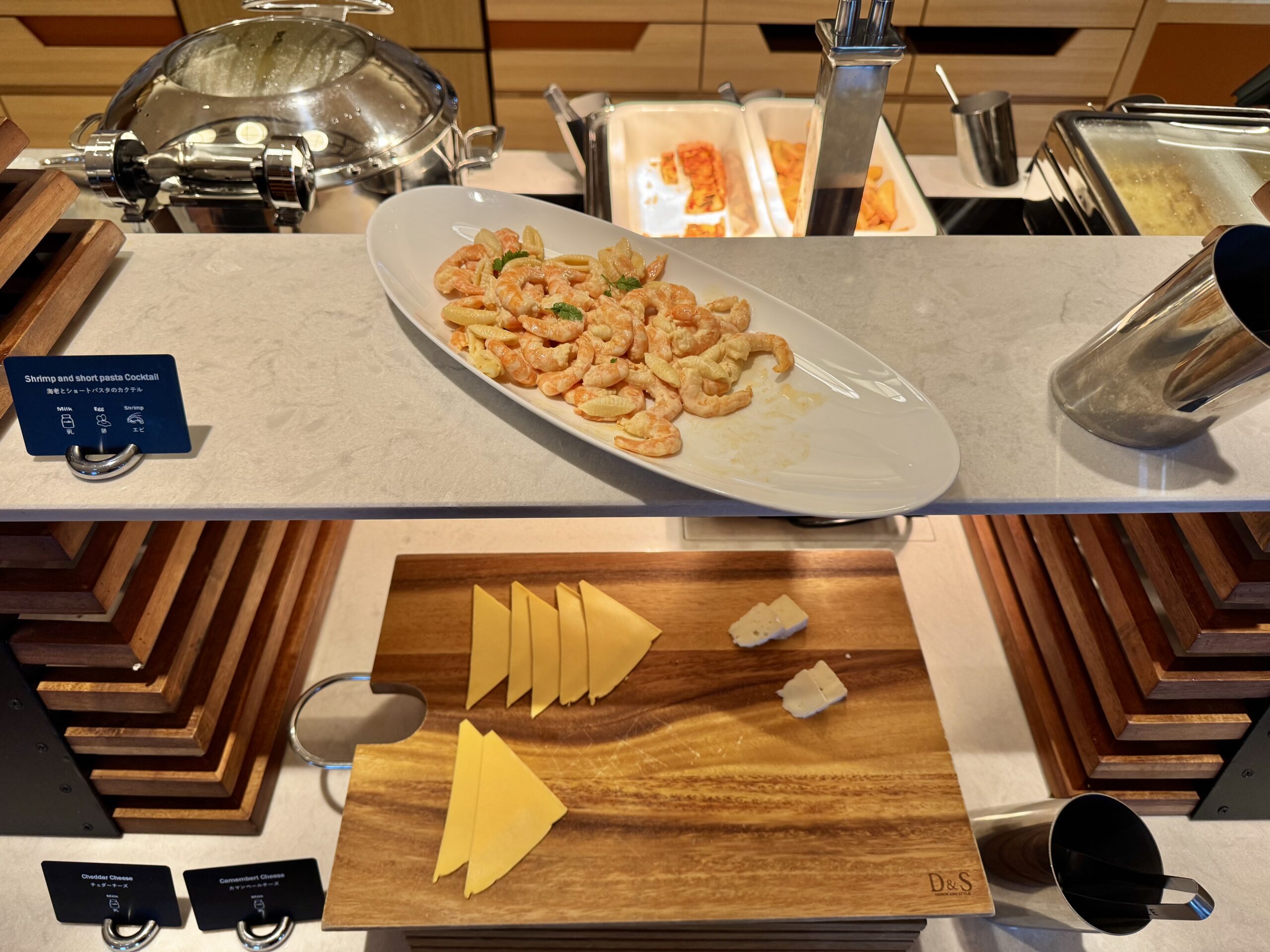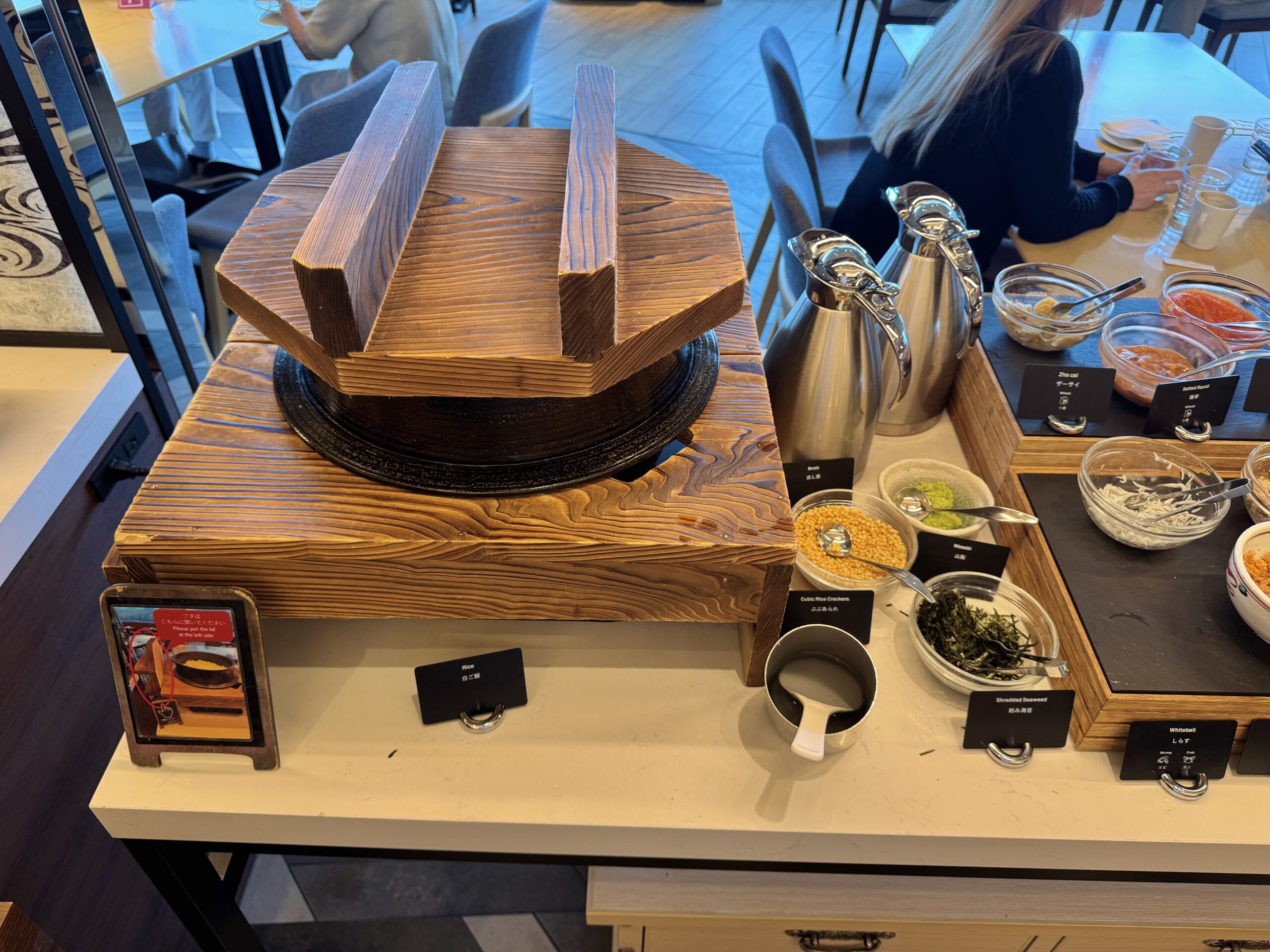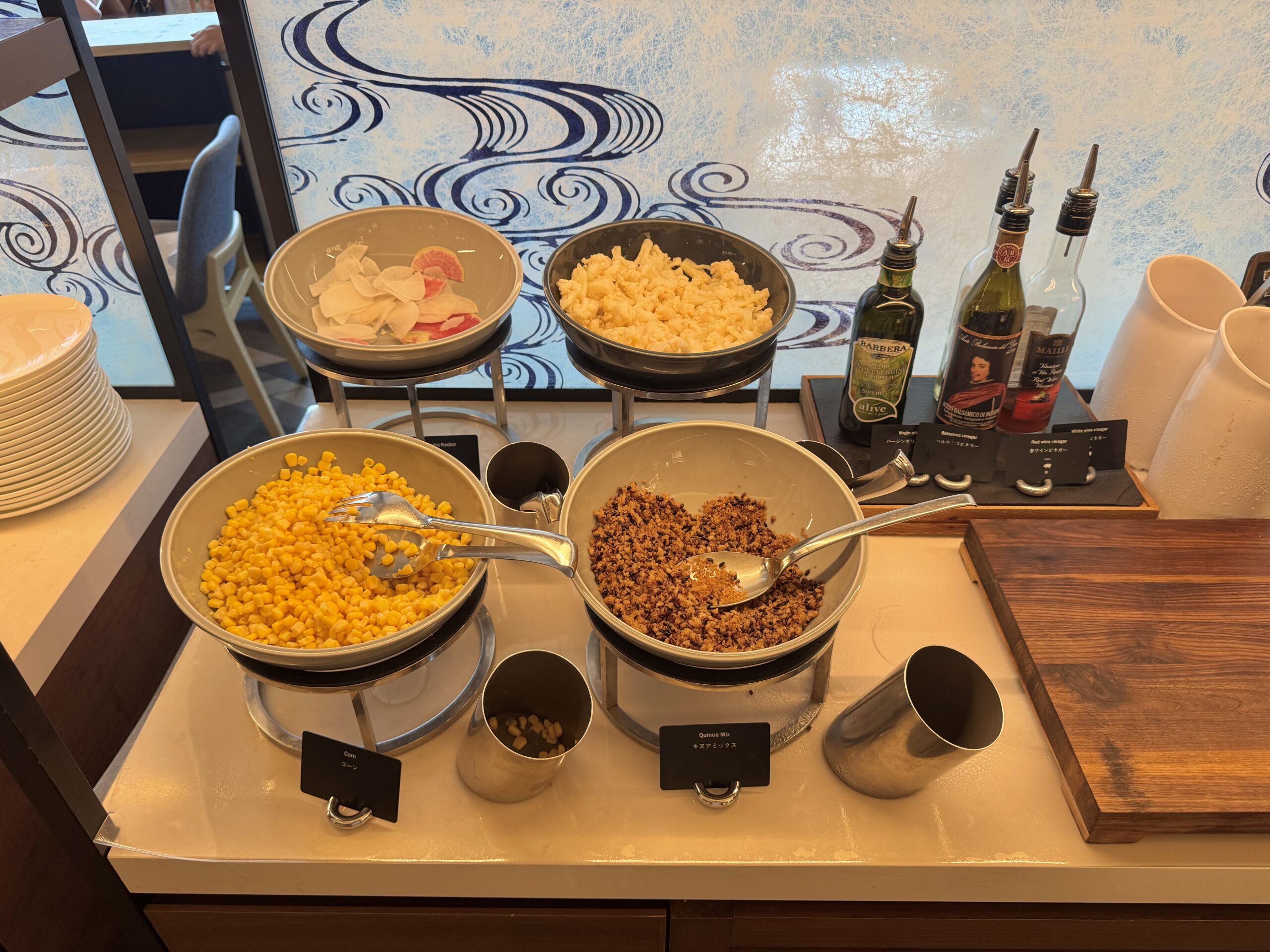 Di seberang meja counter minuman berjajar memanjang pilihan chilled juice buah, salad bar, charcuterie, zosui (hidangan Jepang berupa nasi dengan kuah kaldu), dan masakan pelengkap khas Jepang beserta beberapa macam acarnya.