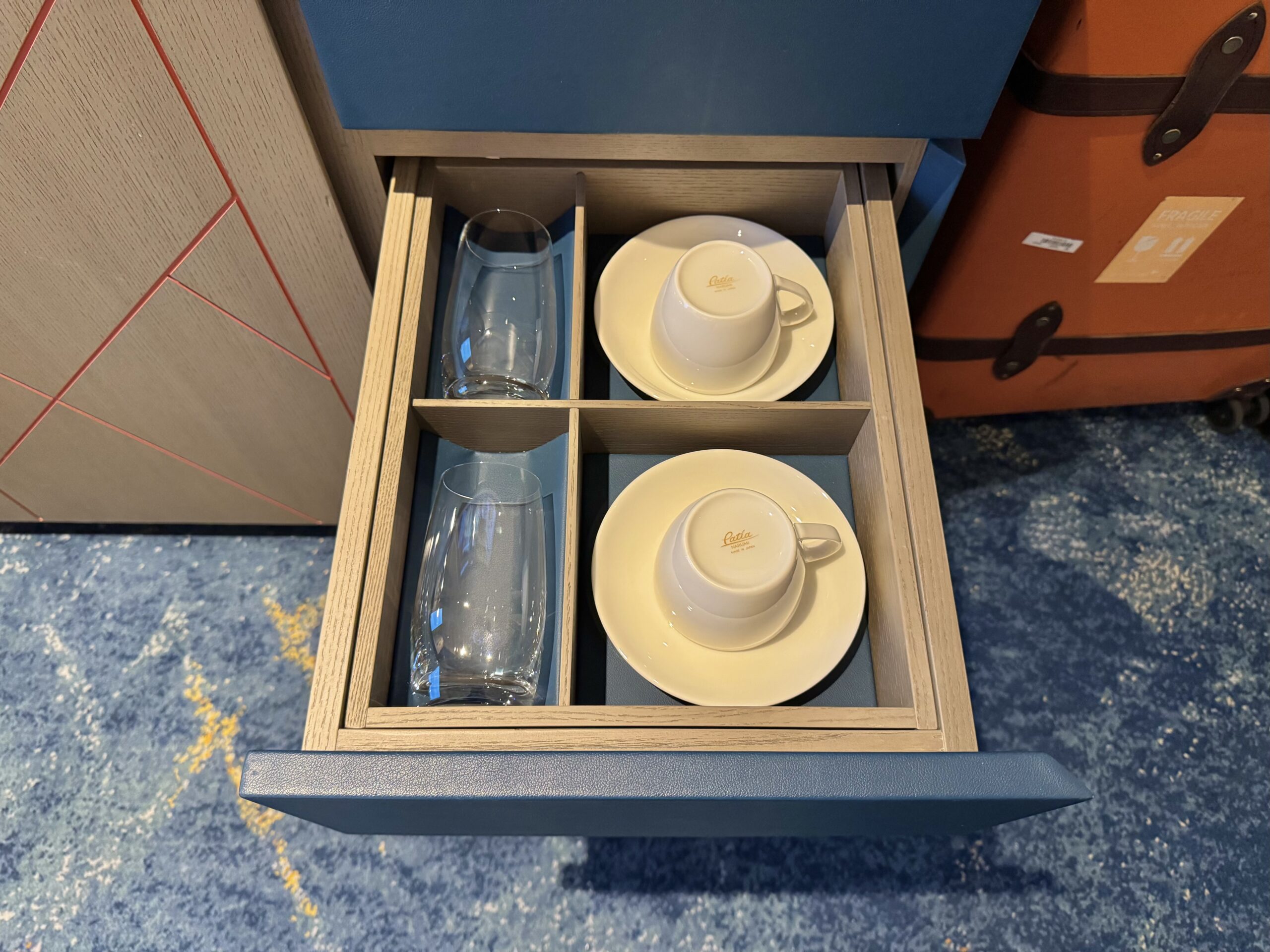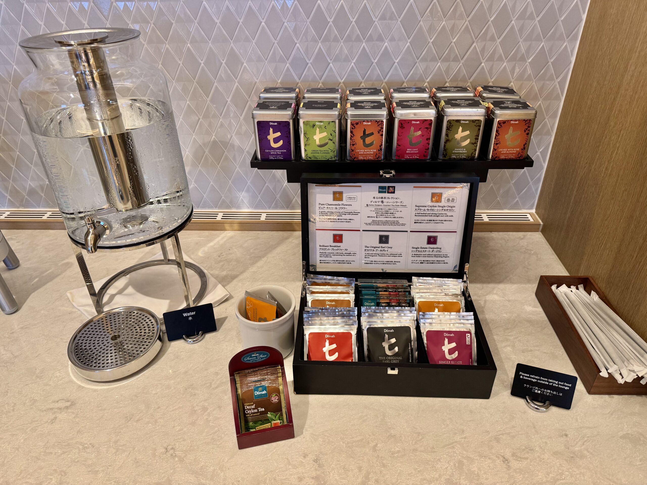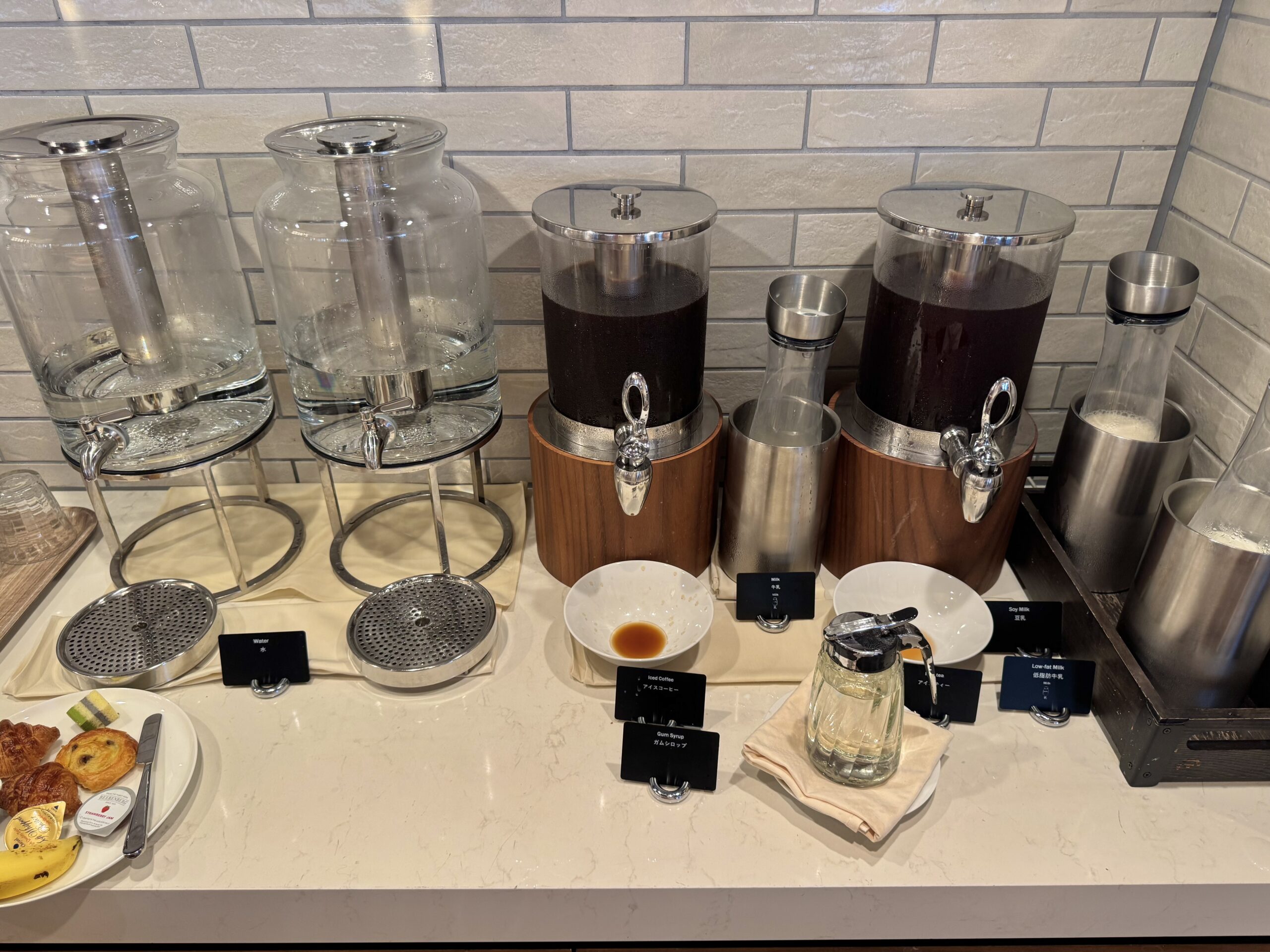 Sebuah meja berukuran kecil yang menempel di dinding dipergunakan untuk memajang beberapa pilihan sereal lengkap dengan buah-buahan kering dan juga beragam pilihan kacang. Bersebelahan dengannya adalah beberapa dispenser air putih, kopi, dan juga susu.