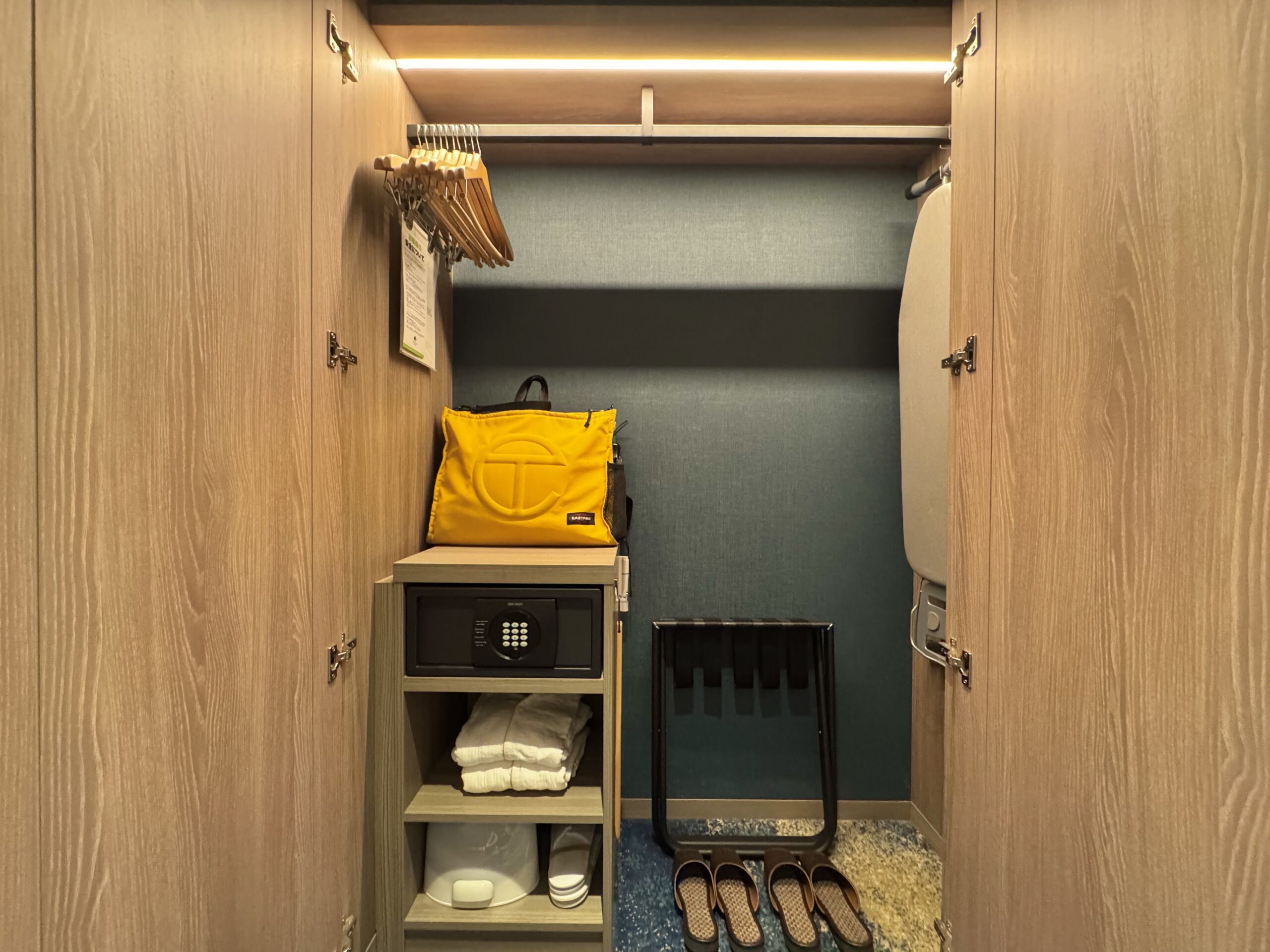 Lemari pakaian selain dipergunakan untuk menggantung pakaian juga dipergunakan untuk menaruh rak koper lipat, safe deposit box, piyama, dua macam slippers, alat setrika beserta mejanya.