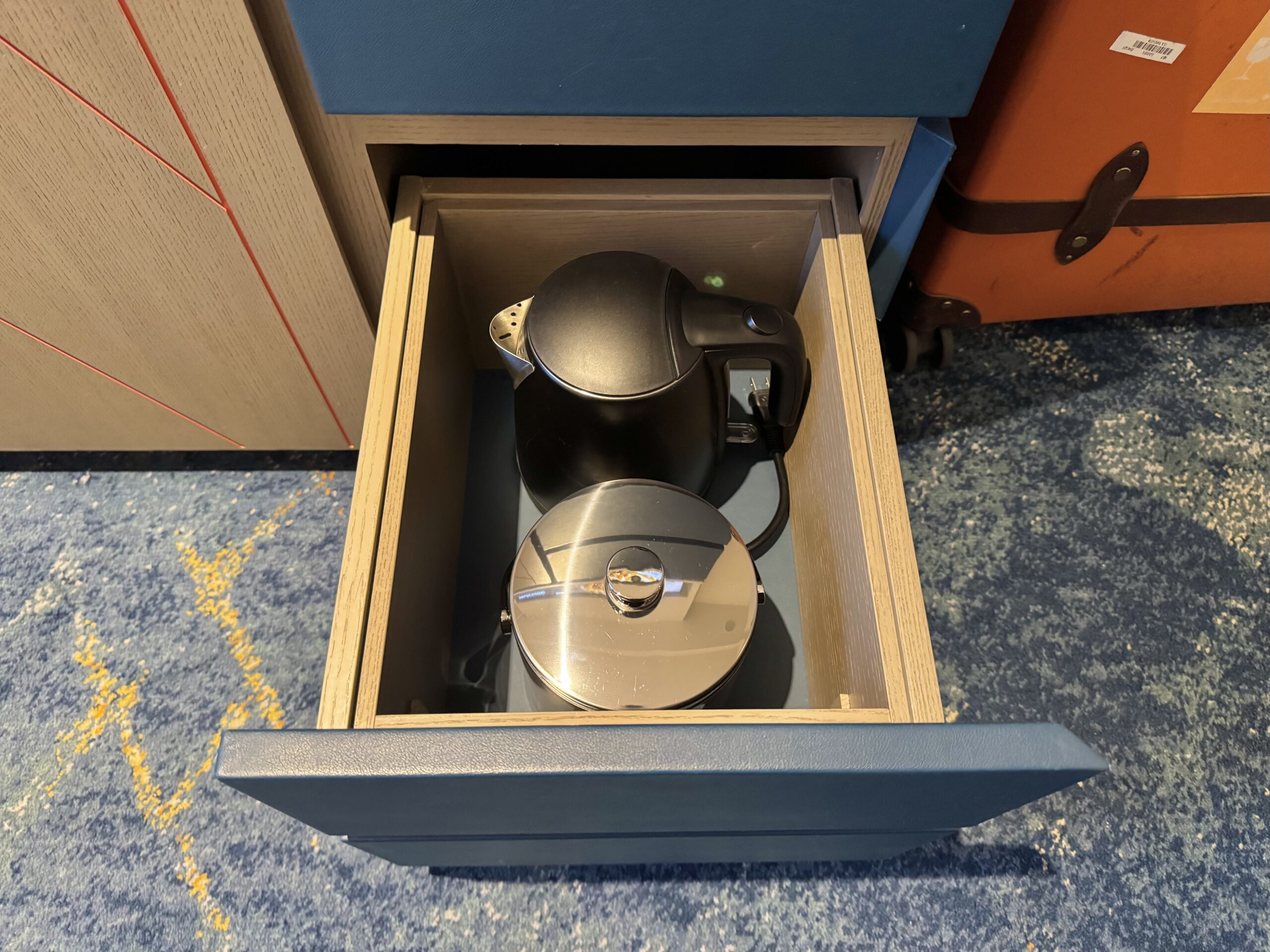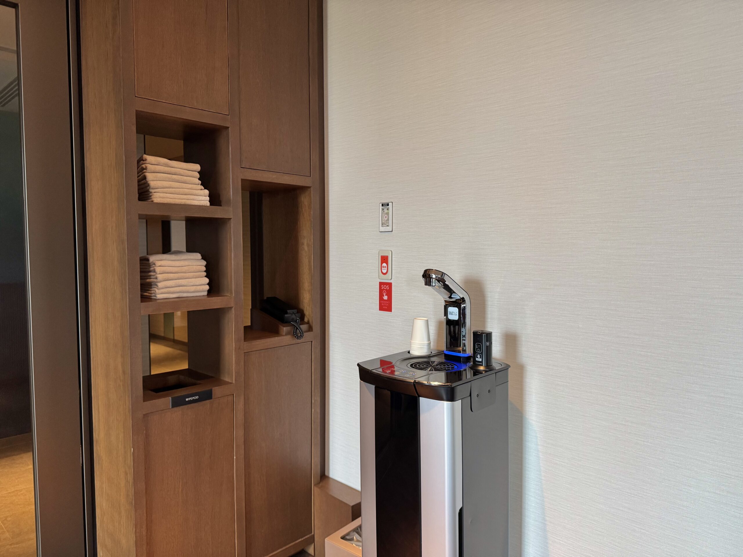 Mereka menyediakan kopi kapsul Nespresso dengan mesin kopinya, dua botol air minum, dan juga sebuah pitcher kosong. Petugas yang membantu check-in memang telah menginformasikan sebelumnya bahwa hanya disediakan dua botol air minum, jika memerlukan air minum tambahan dapat mengambilnya di water dispenser yang telah disediakan di ruangan khusus yang ada di tiap-tiap lantai.