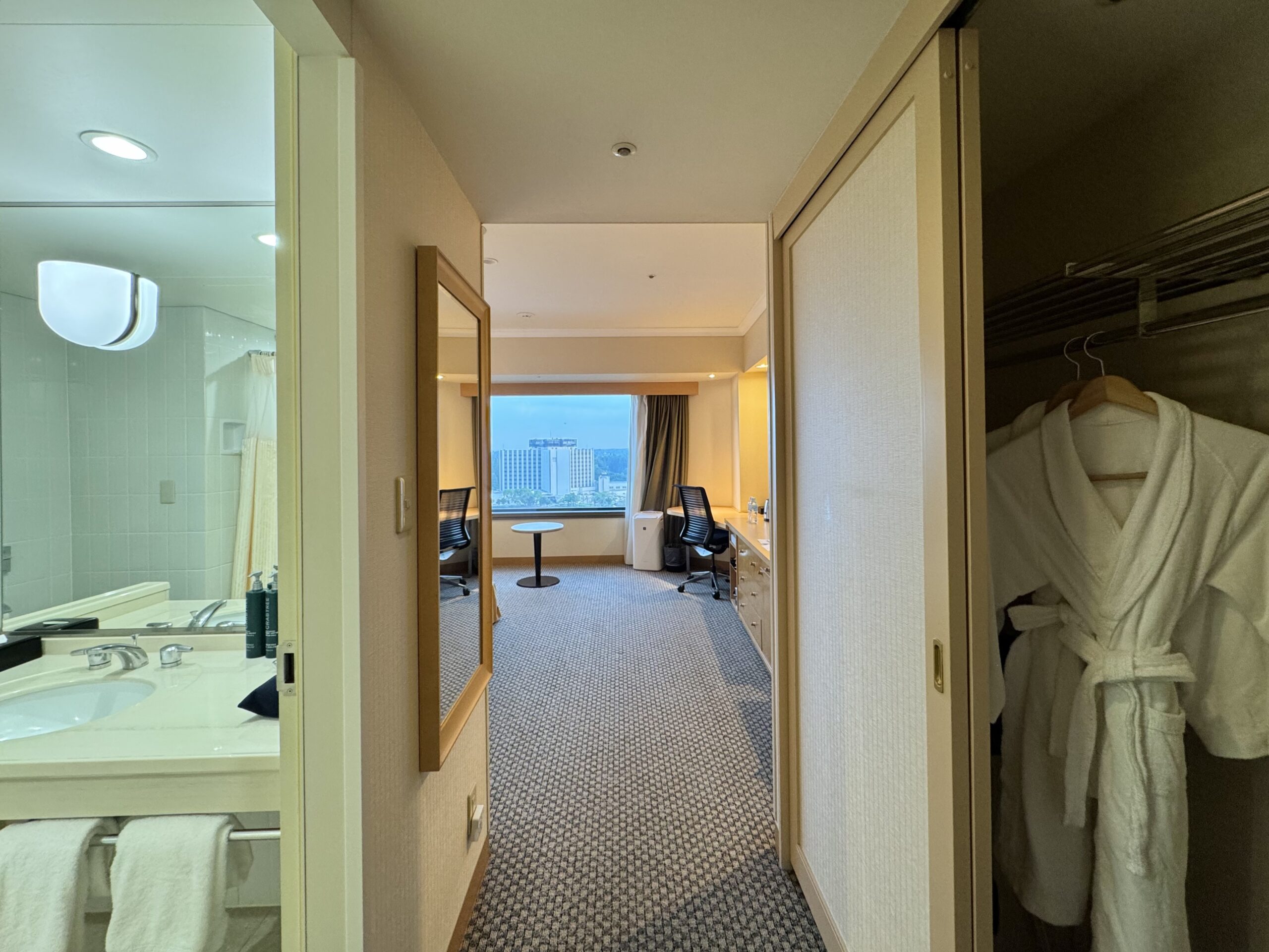 Kamar Queen Deluxe Room – High Floor yang saya tempati ini berukuran lega dengan layout ruangan yang terbilang sederhana. Memasuki kamar terlihat adanya lorong yang diapit dengan kamar mandi di sisi kiri dan lemari pakaian di sisi kanan.